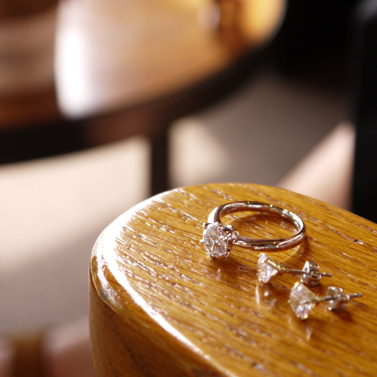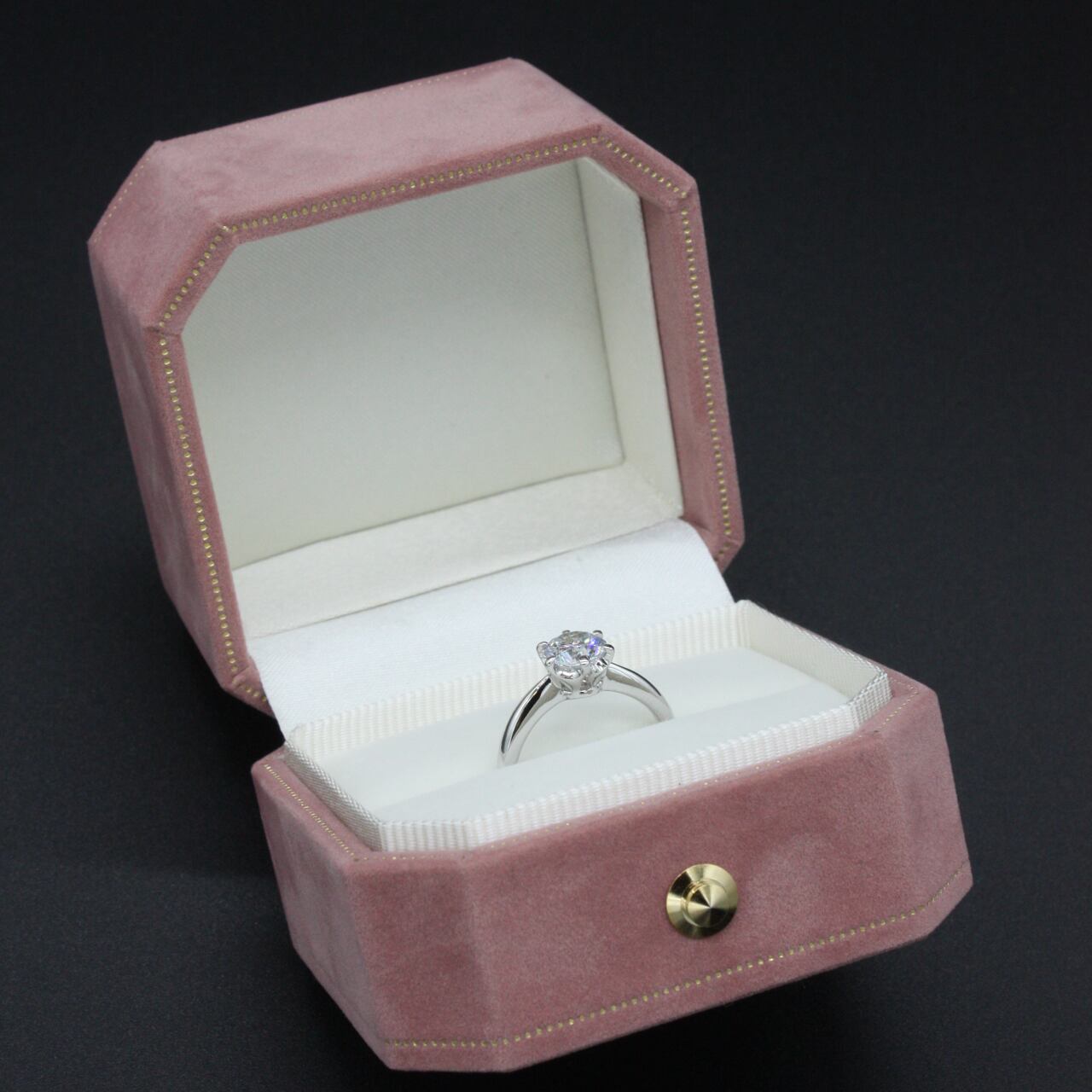 少し高い位置にダイヤがひと粒セットされるこのデザインは、シンプルなだけでなくさまざまな方向からの光が入り最も輝きが強調されます。